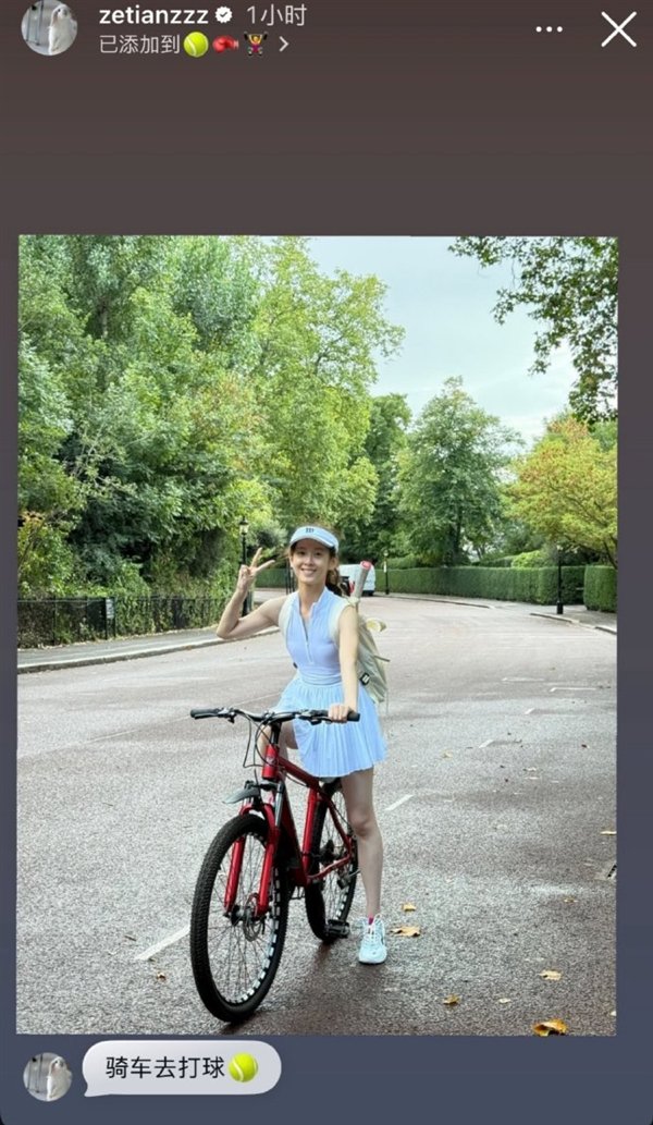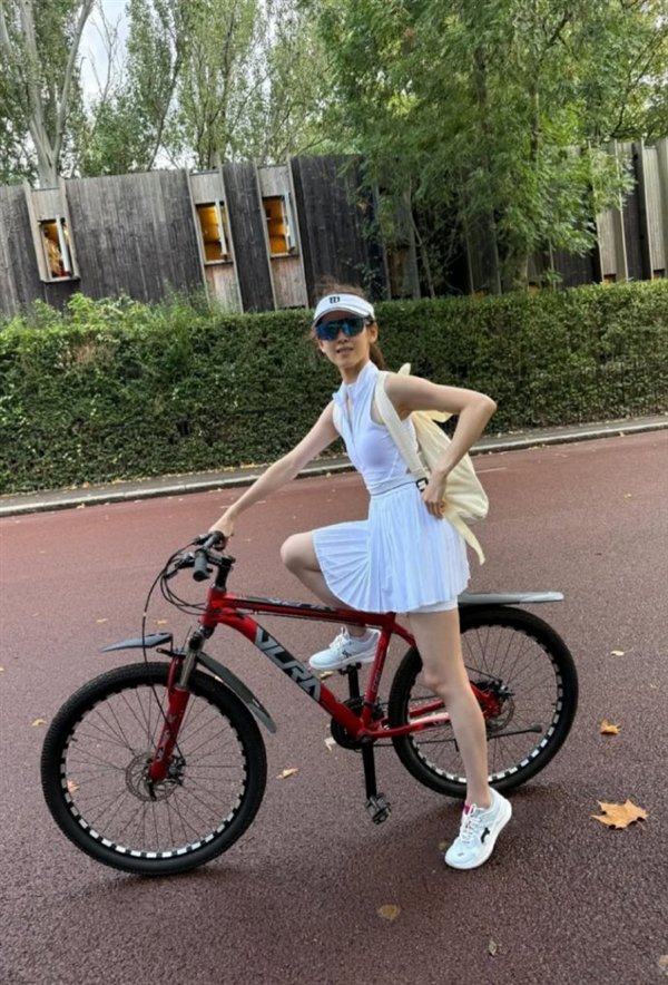 章泽天新照曝光:穿网球服骑单车少女感满满 网友:白到发光